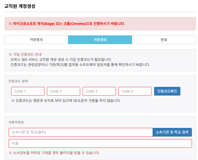 인증코드 및 소속 기관을 검색합니다. 세부 기관이 검색되지 않으면 경상북도교육청을 선택하셔도 됩니다.
