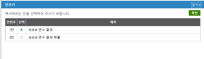 이럴 경우 1, 2안이 있으므로, 복사하려는 안을 선택하는 팝업창이 생성됩니다. 선택하면 해당 본문이 복사되어 3안이 생성됩니다.