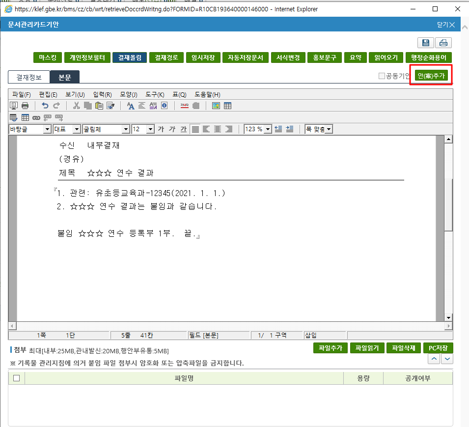 안추가를 클릭 할 경우 1안의 내용이 그대로 반영되어 적용됩니다. 내부결재의 내용과 동일한 내용을 발송할 경우 별도 수정이 필요하지는 않지만, 대부분의 기안은 문구를 일부 수정하여 발송하여야 합니다. 또는 교육청 또는 교육지원청에서 보고 서식으로 제출을 요구하는 경우에 해당 서식에 연수 내용을 정리해서 첨부파일을 추가해야하는 경우도 있습니다. 내용이 다소 다르더라도 문제는 없습니다. 일괄 기안의 의미에서 살펴보았는 것 처럼 '관련성이 있는 경우'는 일괄 기안이 가능하기 때문입니다.