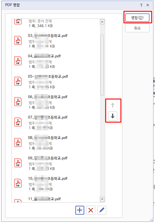 순서대로 불러와 진 모습입니다. 만약 순서조정이 필요하다면 파일을 선택 후 화살표 위, 아래로 조정하시면 됩니다. 순서를 확인하셨다면 병합을 클릭합니다.
