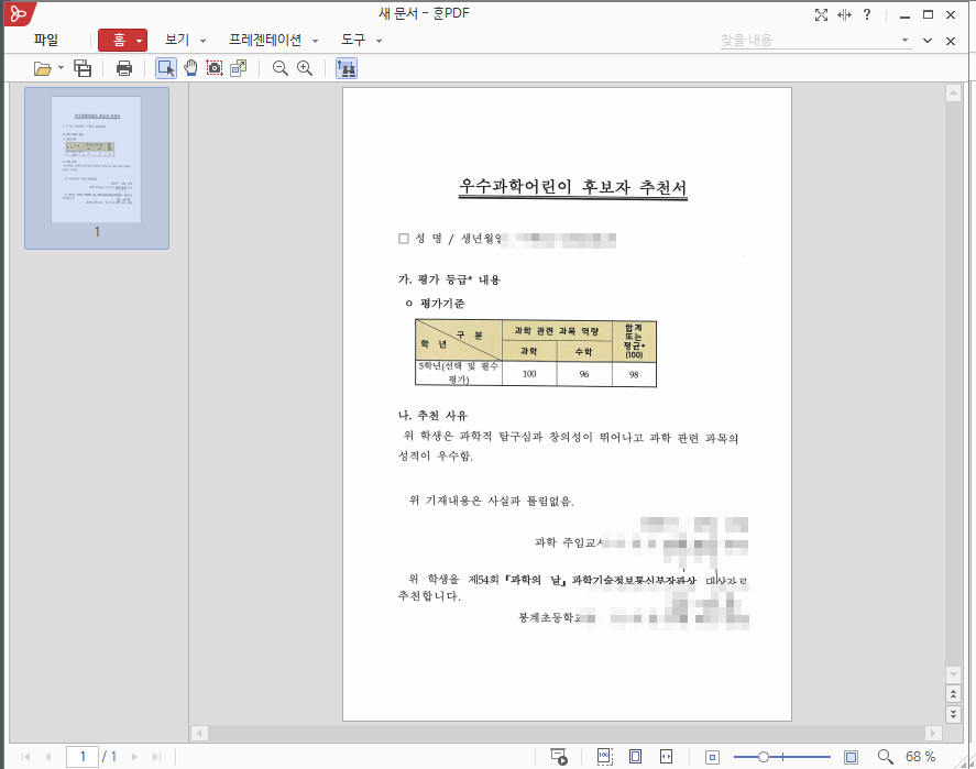 민감정보를 다루기때문에 클라우드 기반 편집도구는 제외하고 매년 경북교육청에서 라이선스를 제공하는 한글오피스 프로그램 중 한pdf를 활용합니다.