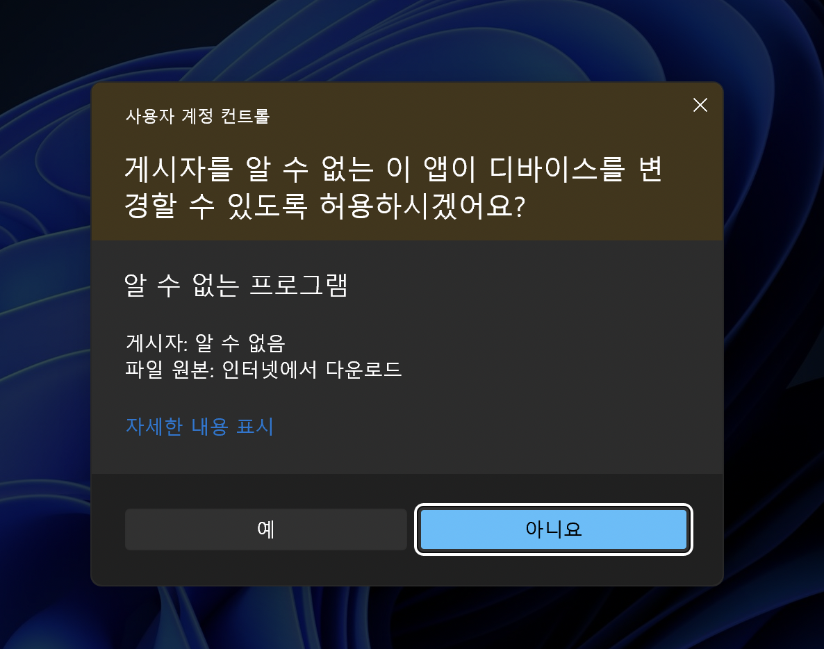 설치를 클릭하고 진행이 안되어 화면을 보니 아래와 같은 팝업이 생성되어서 진행이 안되었네요. 예를 클릭합니다.