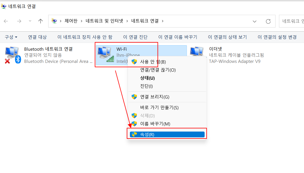 연결된 SKT 핫스팟 와이파이 우클릭 > 속성 클릭