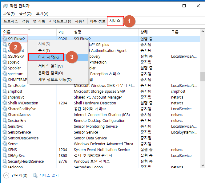 아래 이미지와 같이 서비스 > SSLPlusv2 > 시작 또는 다시시작을 클릭합니다.