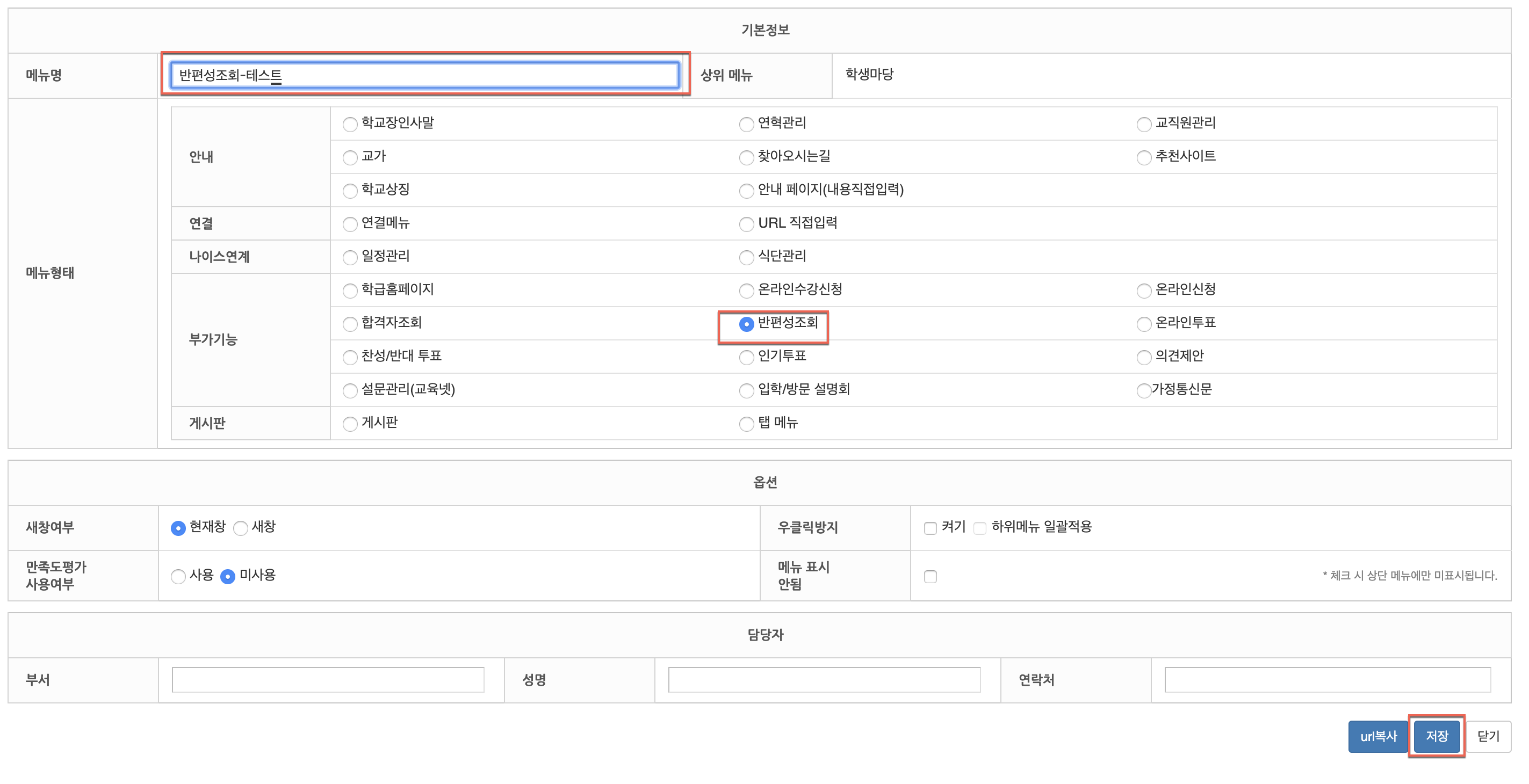 메뉴명(반편성조회-테스트)을 입력하고 메뉴형태에서 반편성조회를 선택후 저장합니다.