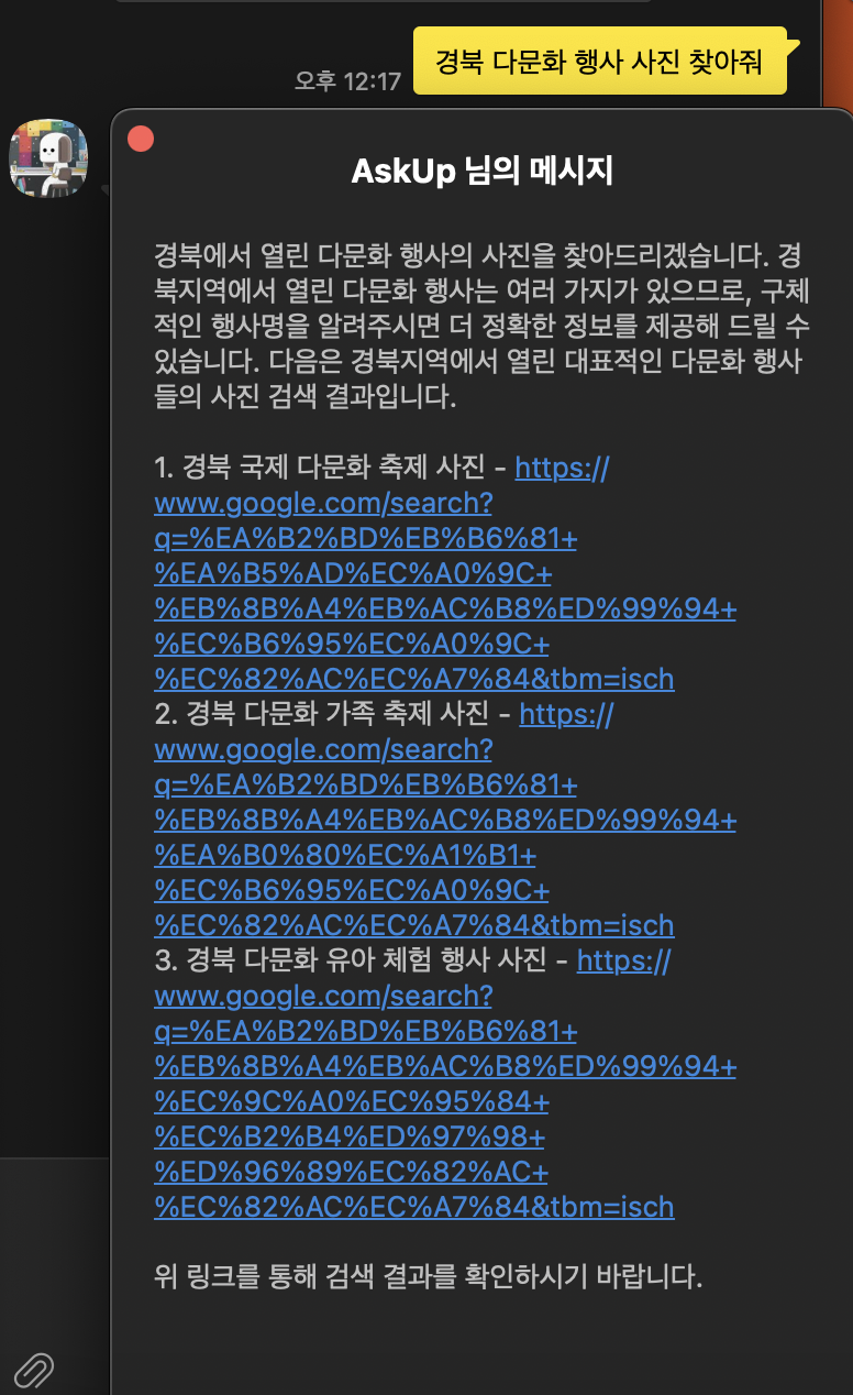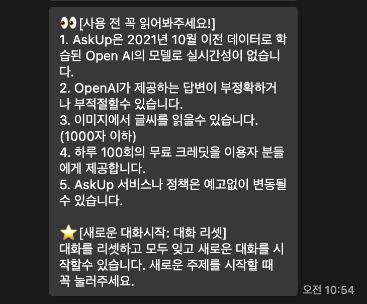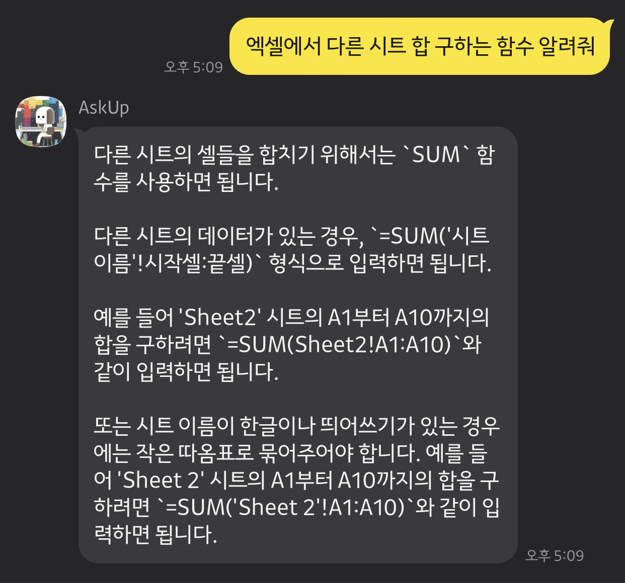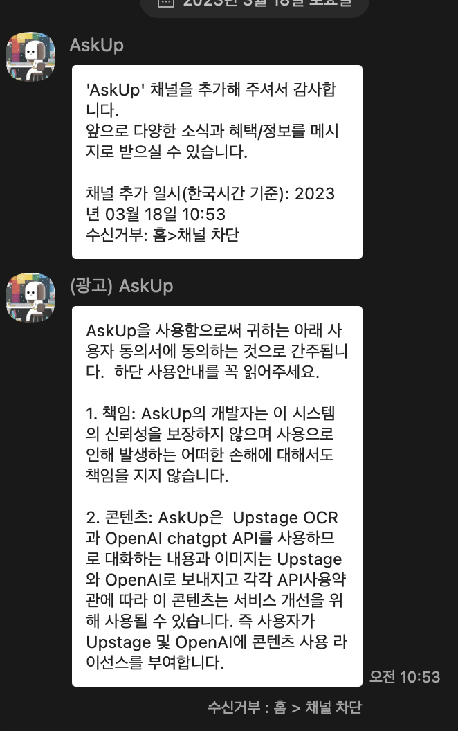챗GPT의 api를 활용하여 카카오톡 채널로 제공하는 서비스인 AskUp(아숙업)을 소개해드립니다.