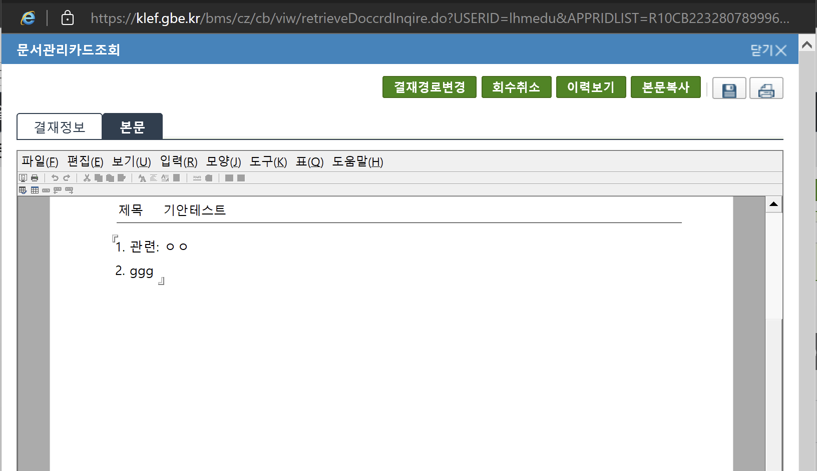 유사한 행사를 올해 다시 진행해야 하므로 ①재작성을 클릭합니다. 새로운 기안창이 열리면서 기존 제목, 본문이 그대로 가져와 집니다. 그런데 보이시나요? 제목의 글자체는 새로 바뀐 맑은 고딕으로 되어 있으나 본문은 기존 궁서체 그대로입니다. 이 기안문을 숫자와 내용을 수정해서 올린다면 결재자에게 굴림체가 그대로 노출됩니다. 일부 서식에 맞는 수정이 필요합니다.