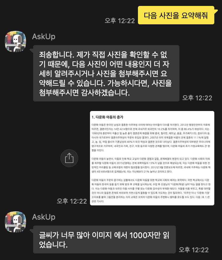 다음은 사진을 요약해달라고 해보았습니다. 1000자 이미지까지만 요약이 가능하네요..