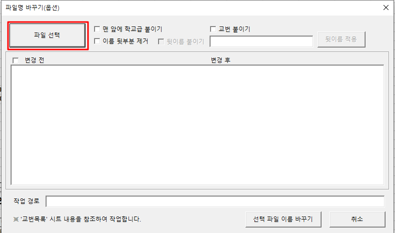여기에 입력된 교번과 학교명을 바탕으로 파일명 바꾸기가 진행이 됩니다.