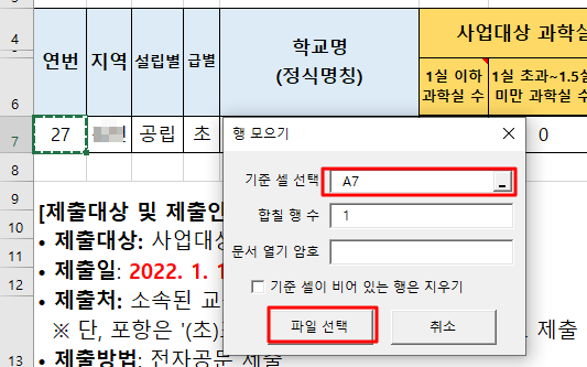 예를 들어 학교별로 수합된 파일의 행이 다를 경우 일부 학교의 자료가 오류로 수합이 되지 않습니다. 그래서 저는 파일을 열어서 행이 맞는지 확인을 해 둡니다. 아래 파일의 경우 7행에 입력된 데이터가 수합이 되는데.. 8행또는 6행에 입력이 된경우 동일한 7행으로 수정이 필요합니다. 학교별로 공무을 보내실때 서식 수정을 하지말라고 하는 이유도 여기에 있습니다. ^^;