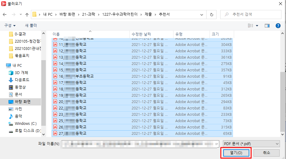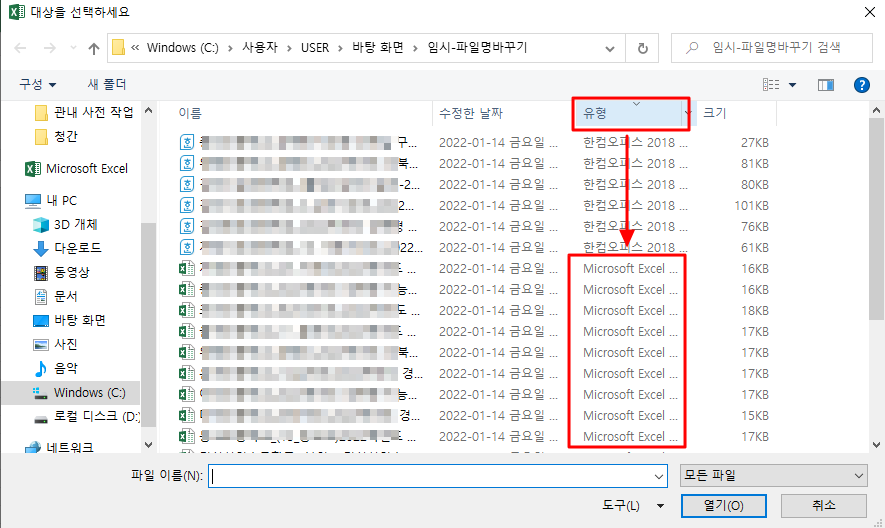 유형을 클릭하여 엑셀 이외의 첨부파일과 구분되도록 설정해주신 후 , 처음 파일과 마지막 파일을 shitf를 눌러서 선택 후 열기를 클릭합니다.