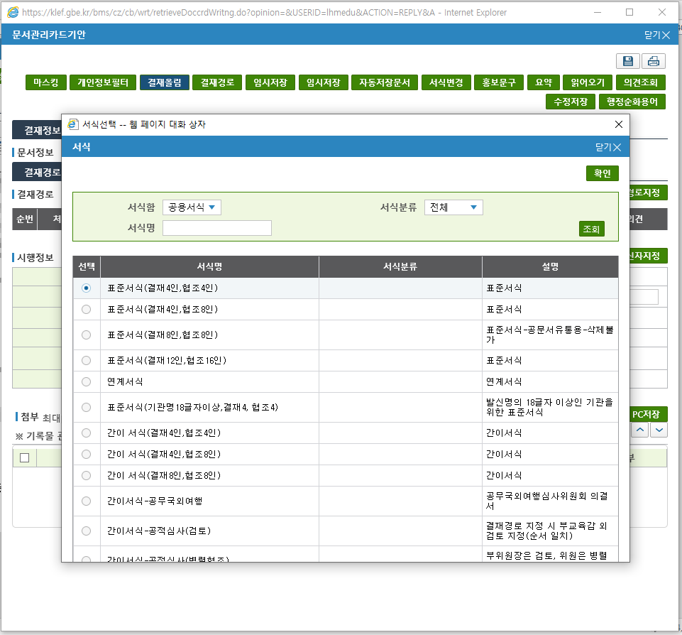 그러면 서식 종류를 선택하는 팝업창이 생성됩니다. 기안시 공용서식 선택화면과 유사합니다. 서식 종류를 선택하고 확인을 클릭합니다.
