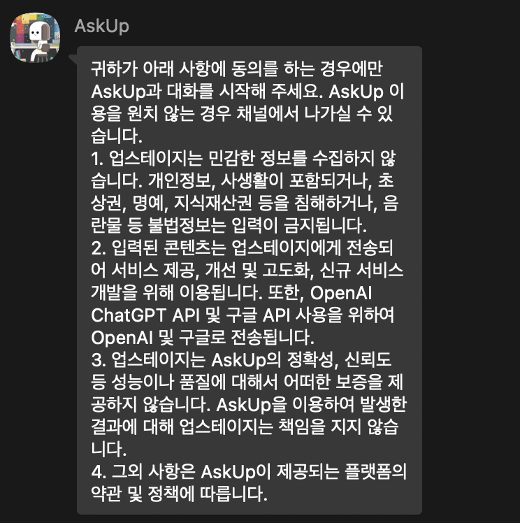 - 좌측 상단 메뉴를 탭하면 기존 질문 리스트를 확인하고 이어서 대화를 이어갈 수 있습니다. 토큰을 절약하기 위해서는 주제가 달라지면 새 대화 시작을 탭하여 질문을 시작하는 것을 추천합니다.
