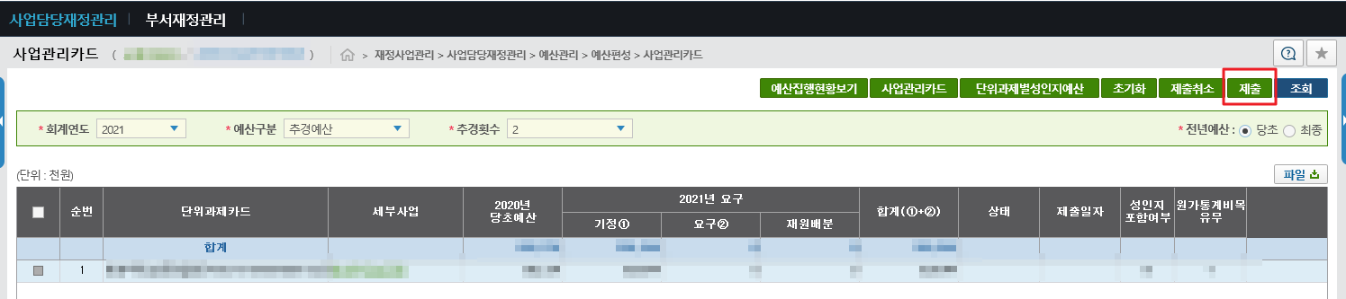 목록으로 나와서 우상단의 제출을 클릭하면 예산 담당자에게 제출됩니다.