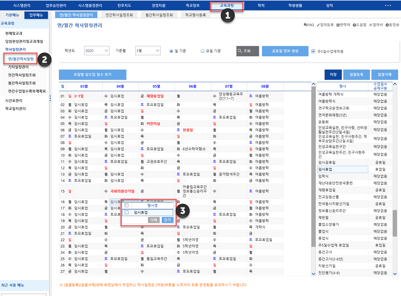 먼저 학교에서 학사일정 담당 교사(연구부장)가 나이스 / 교육과정 / 학사일정관리 / 연월간학사일정에서 기존 행사를 삭제하고 임시휴업을 등록합니다. 만약 '임시휴업'이라는 학교행사가 없다면 4.학교행사등록을 클릭하여 '휴업일'로 설정후 저장하면 우측 행사에서 조회됩니다. 5. 저장을 눌러 학사일정을 반영합니다.