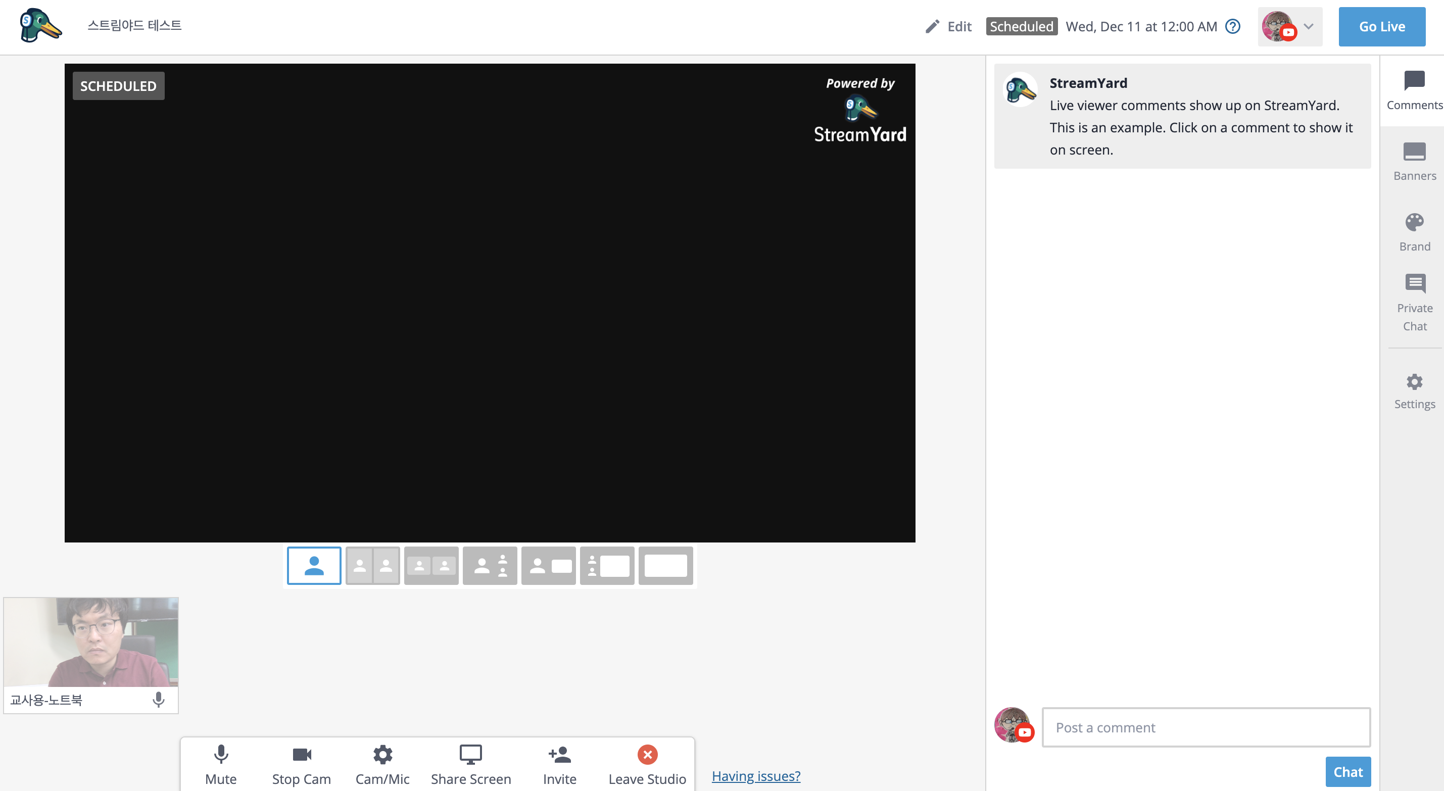이제 기초 사용법에 대한 설명은 모두 마쳤습니다. 화면 우측 상단의 "Go Live"를 반드시 클릭하여야 라이브 스트리밍이 가능합니다. 예약을 한 경우도 꼭 눌러주어야 한다는 점을 기억하시길 바랍니다.
