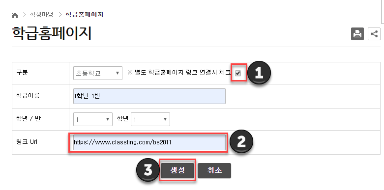 생성된 학급 홈페이지 설정창에서 1. 별도 학급 홈페이지 링크 연결시 체크를 선택하고, 클래스팅 학급의 맞춤형 URL을 입력합니다. 이 단계까지 설정하시면 학급 홈페이지 섬네일을 클릭했을때 외부링크로 이동합니다.