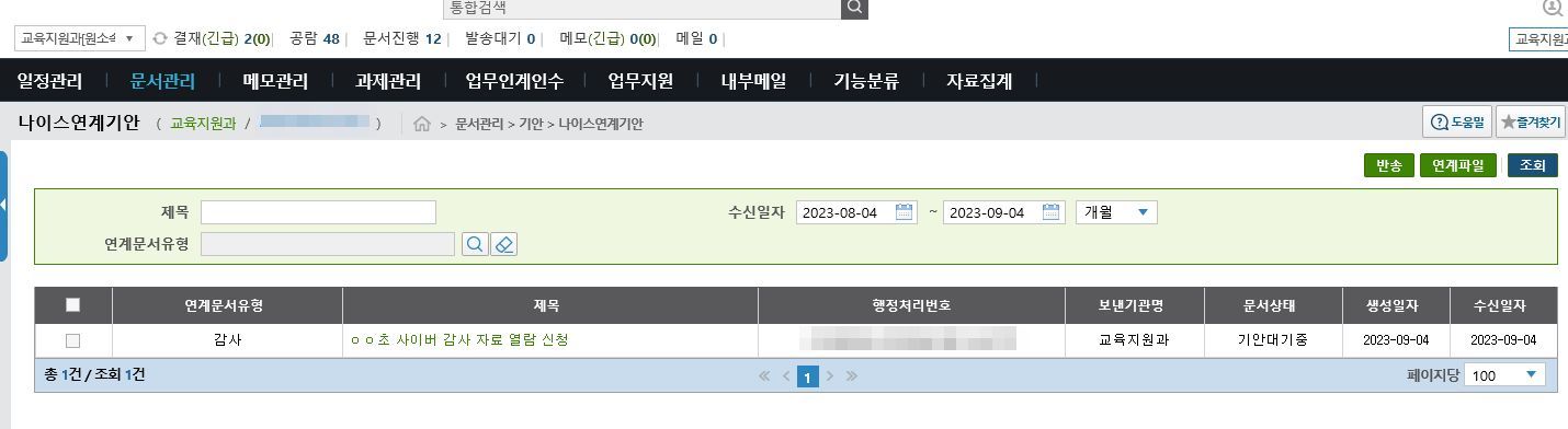 화면에 별다른 변화는 없으나, K에듀파인 문서관리 > 나이스연계기안에서 확인이 됩니다.