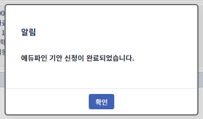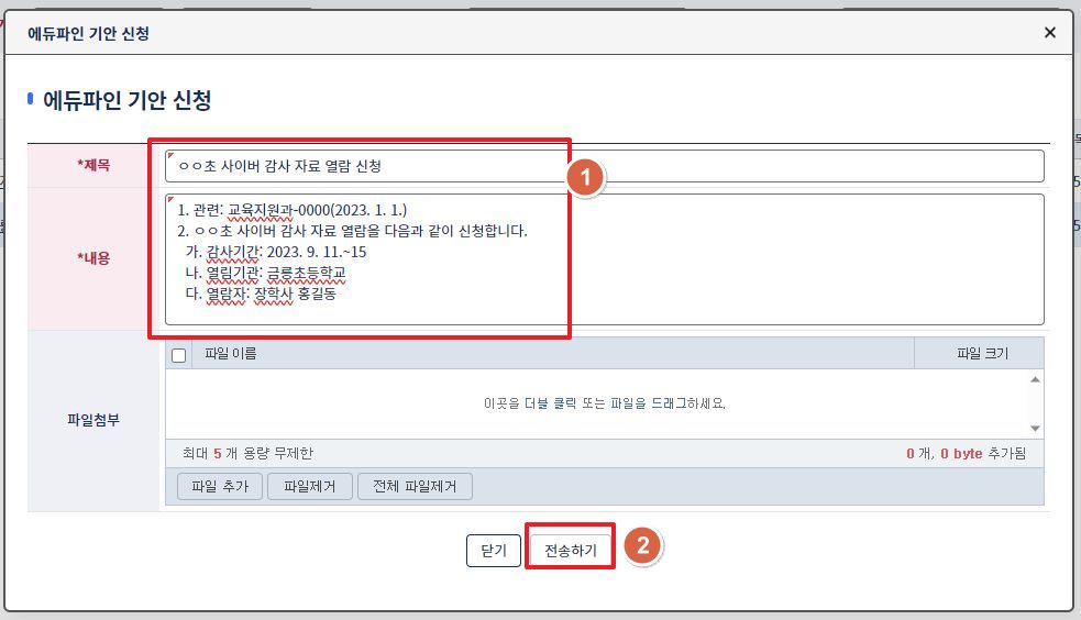 에듀파인 기안 신청을 아래와 같이 입력 후 전송하기를 클릭합니다.