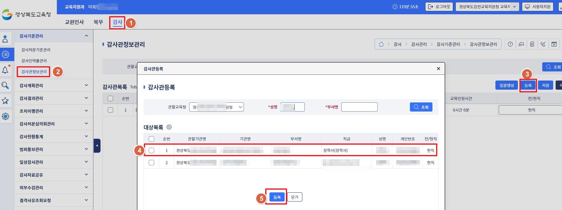 사이버감사 조회권한자(5)를 설정합니다. 사이버감사 조회 권한자에서 조회가 안되는 경우 추가 절차가 필요합니다.