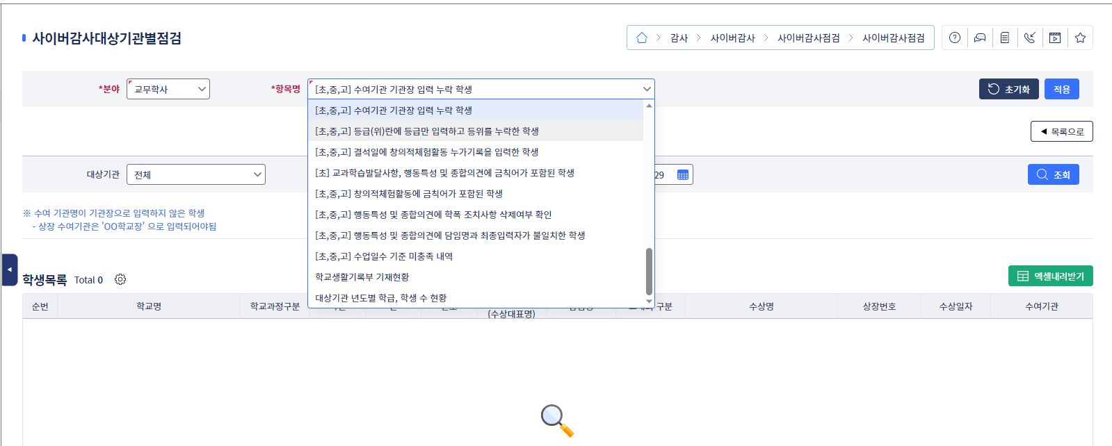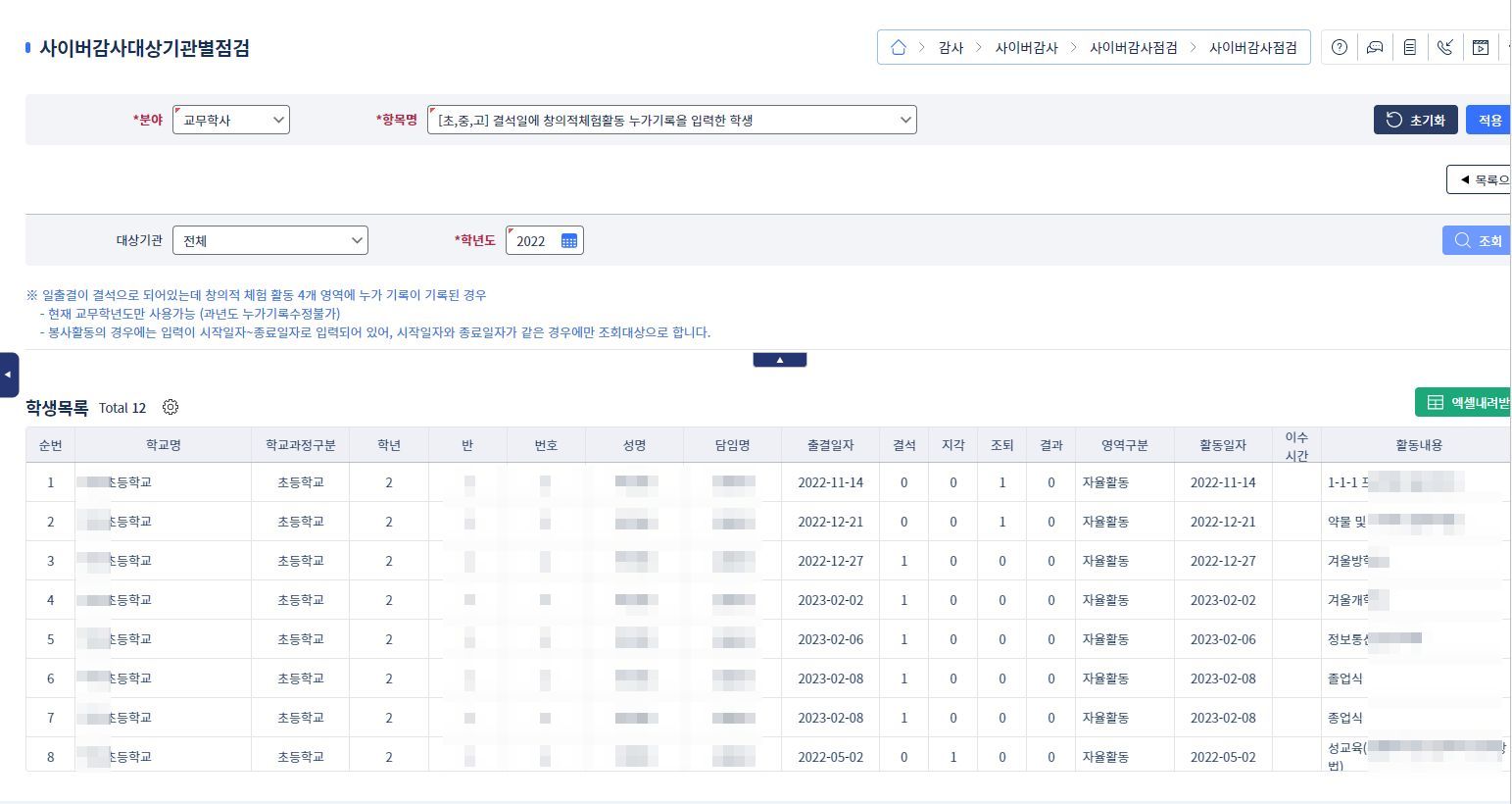 학생부의 경우 3회 점검이 필요하니, 미리 사이버감사 기능을 활용하면 빠른시간에 업무를 처리할 수 있을 것 같네요.