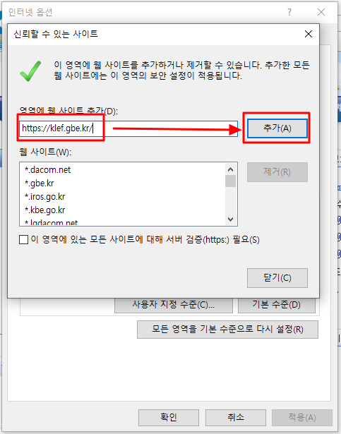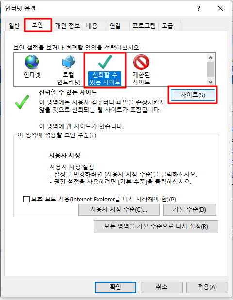 보안 > 신뢰할 수 있는 사이트 > 사이트를 클릭합니다.