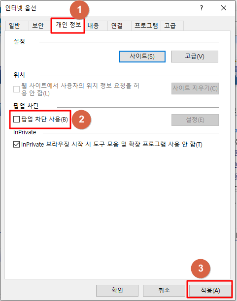 개인정보 > 팝업차단 사용 체크해제 후 적용 클릭