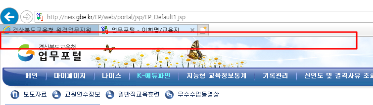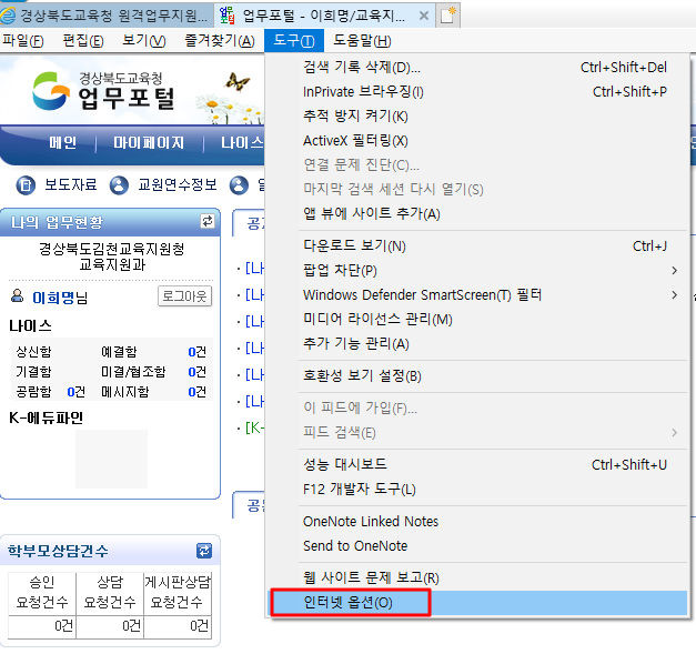 이번에는 업무포털에 로그인 했는데 나이스 현황은 미리보기가 되지만, K-에듀파인의 경우 미리보기가 안되어서 공문 결재 및 공람, 내부메일 등의 요약 정보를 볼 수 없을 때 해결방법을 공유합니다.