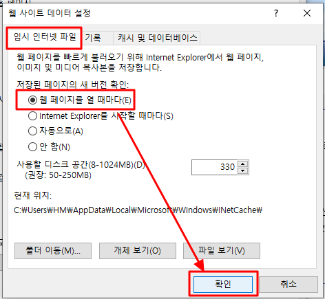 임시인터넷 파일 > 웹페이지를 열 때마다 > 확인을 클릭합니다.